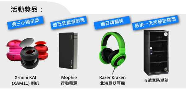 12/3 週三小週末獎、12/7 週日嗨翻獎、 12/16 終極密碼獎(終極密碼獎防潮箱為已拆封全新品)