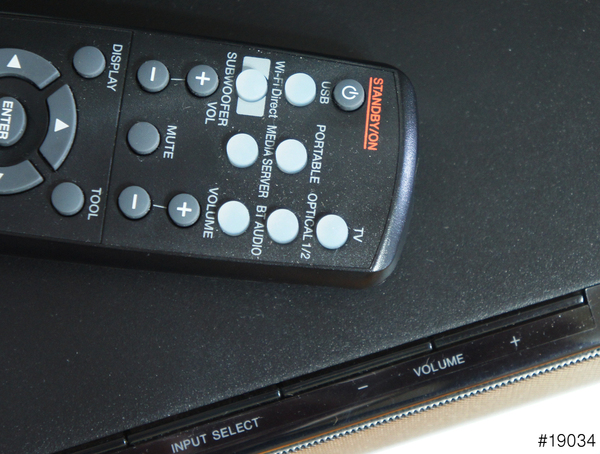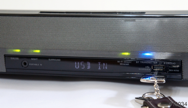 開機後可見到主揚聲器LED螢幕會跑出資訊,原則上幾近都以遙控器操作,螢幕右邊可見到USB孔,能用來直接讀取隨身碟或外接硬碟中的多媒體內容。