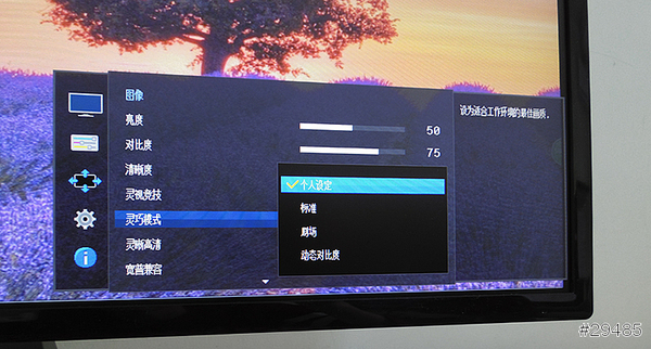 曲面显示器的功能很多,看看菜单就知道了,我今天就说说灵巧模式,它有四个功能个人设定、标准、剧场、动态对比度。标准模式适合适合浏览网页,剧场模式适合看电影,动态对比度是根据环境改变整体的对比度。具体如下图