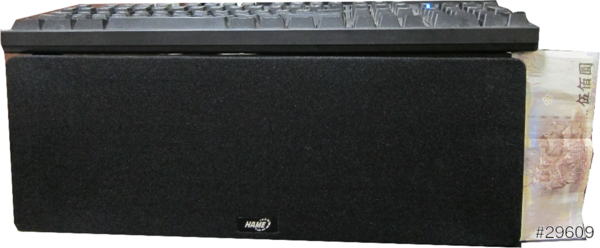 硬梆梆 420 x 225 x 150 mm 的規格也許沒什概念,但就如同下圖所示,標準鍵盤的長,五百元鈔的高,這樣的體積擺放在電腦桌上應該是很容易,其重量約4Kg,差不多2台筆電重。