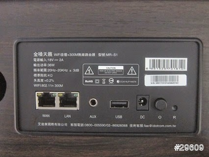 背後有多項的輸入接口(WALNLAN/USB/AUX),還有兩個音孔,音箱應該是採反射式設計,以達到較佳的低頻量感與延伸。