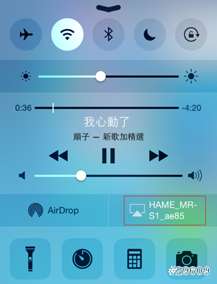 3. 連接上HAME後,手機螢幕下方往上滑,叫出設定畫面,點底下紅色方框會進入第2個設定畫面,設定為HAME_MR_S1_XXX ,按完成。