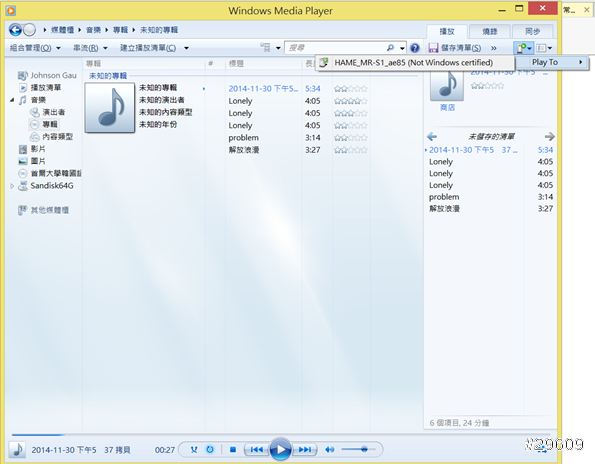 3. 打開Media Player,左邊上面下來第二排,有個Play to的按鍵,點下去選擇HAME_XX就可以推送到HAME MR-S1音箱。