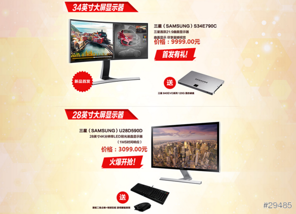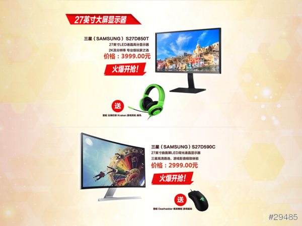 有好多型号的显示器呢,越大屏送的礼物越大,大家抓住机会呀,对了上图不是所有的型号,除了图中的型号还有:S27D590P S27D360H S24D390HLW S23C350B一共10款显示器总有一款你喜欢吧,我中意的就是三星曲面S27D590C