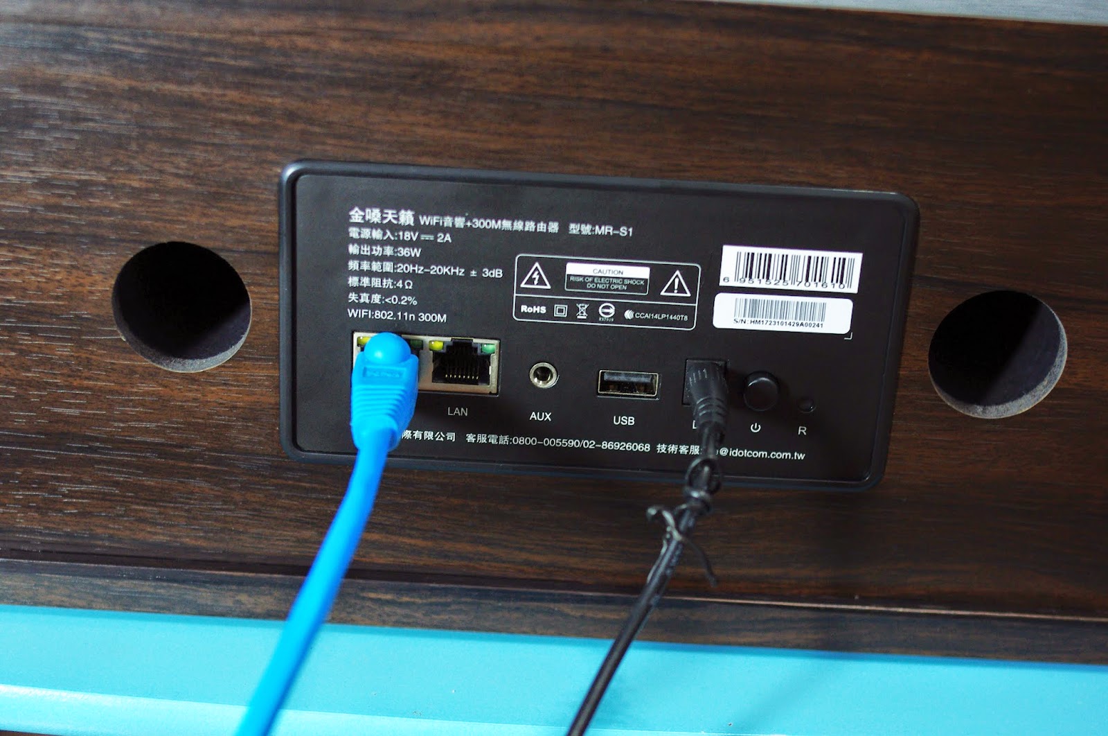 ▼ MR-S1 的背面介面處,WAN (廣域網路)是網路來源的接頭、LAN (區域網路) 是唯一一個的網路輸出的接頭、AUX 是可以利用 3.5 mm音源線來接電腦或是音樂輸出裝置,當然也可以直接支援隨身碟或是硬碟播放的 USB 2.0插槽來聽音樂。