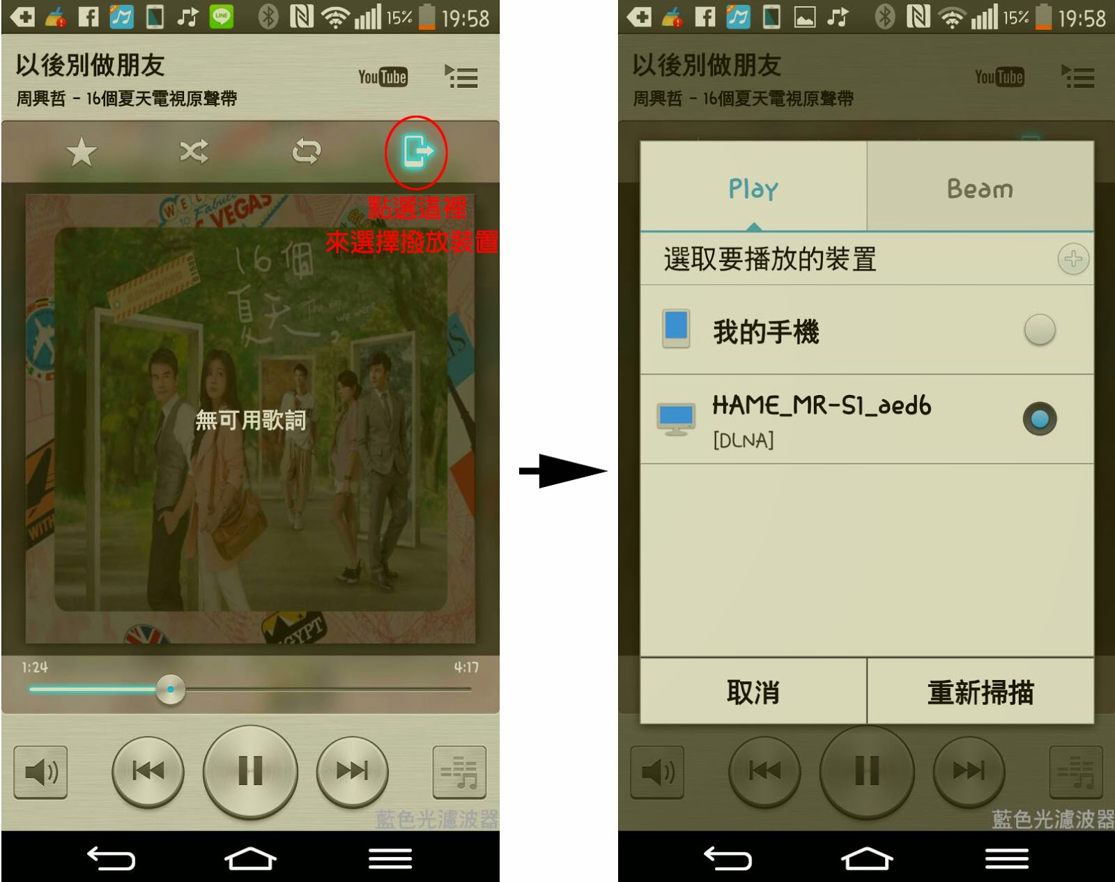 ▼ Andriod 的智慧型手機只要用內建的音樂軟體,然後把"播放裝置"設為"HAME_MR-S1_XXXX"馬上就可以讓 MR-S1 播放手機上的音樂,我有試過小米2、HTC J、LG G2 PRO 來播放音樂,底下是以 LG G2 PRO 為例,感覺很簡單方便,只是每個廠牌的Andriod 手機中設定有所不一樣,都要花點時間去找"播放裝置"設定"。
