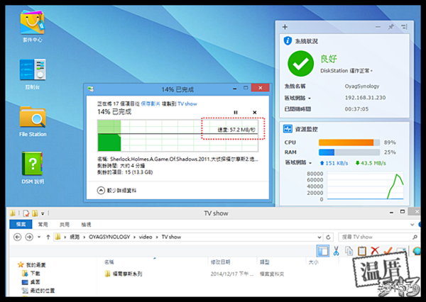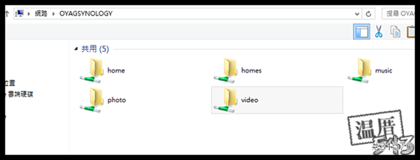 你可以透過電腦的網路芳鄰直接找到安裝好的 Synology DS215j NAS設備,像溫厝這台輸入 \\oyagsynology 就可以看到上頭的這幾個資料夾。