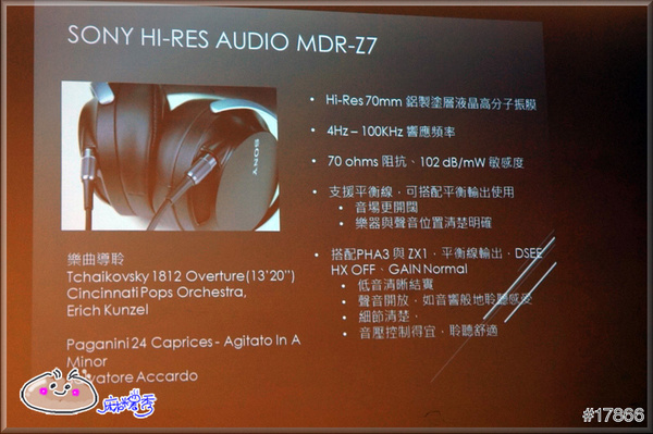 ▼接下來看MDR-Z7這個產品是比較高檔次的產品,它很特別的是右左二邊都有耳機線;也因為如此可以把要釋放的壓力得到比較好的方式釋放,相對的可以把音質表現的更好。不像只有單邊線的,因為會比較難釋放所以有的會聽到金屬的聲音。而它的音質聽起來,低音及微細的聲音都可以聽到,而且很軟的聲音。讚啦~~