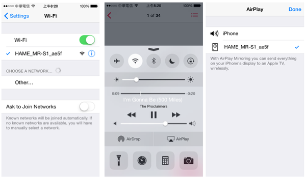 在iphone 手機 airplay 的部份,操作也是非常簡單,只要手機連上 MS-R1 的 wi-fi,然後點選 airplay 即可輕鬆播放。Android 也有相對應的 app 可以下載使用。