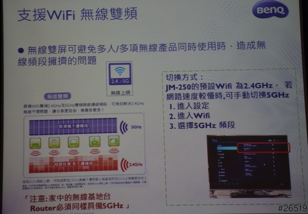 ▼5G WiFi真快速, BenQ JM-250 支援WiFi 的5G頻段,可以避免環境中的