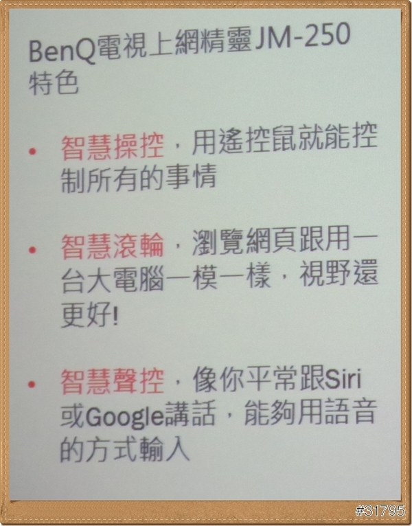 第一張簡報就道出了JM-250的強項!可以讓電視變成像是在操作手機那樣的上手