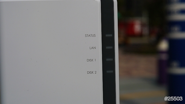 右側指示燈由上到下為狀態指示燈、網路傳輸指示燈、兩顆硬碟的運作狀態燈。