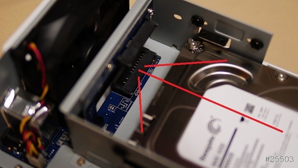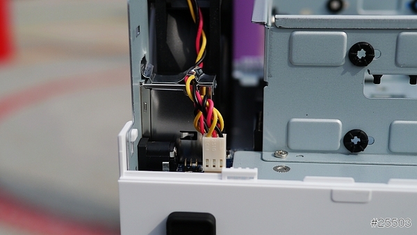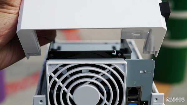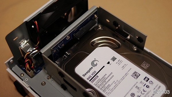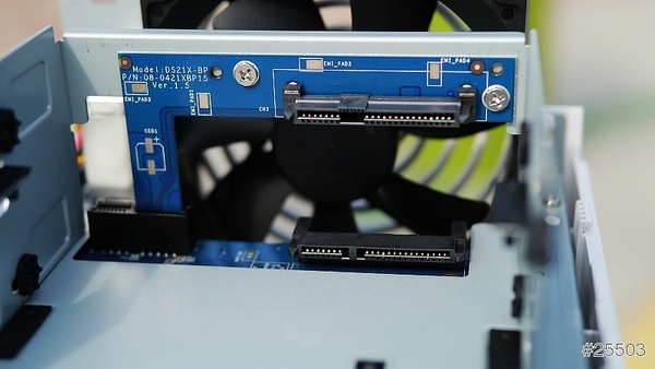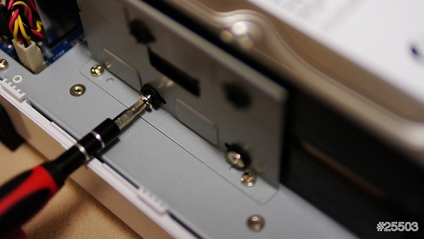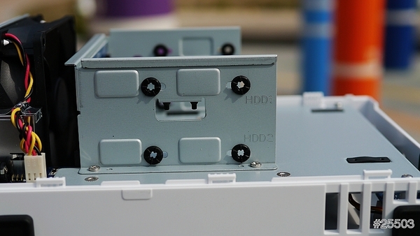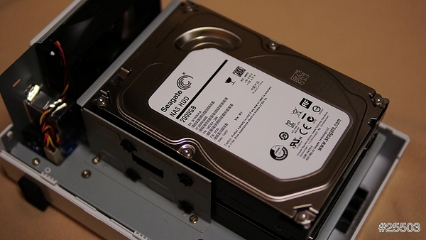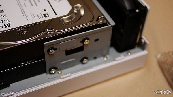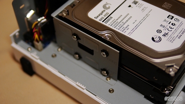 之後就可以看到放置硬碟的地方,可以看到DS215j屬於2-bay的機種,最多裝置兩顆硬碟,其中可以看到硬碟鎖螺絲的地方都有加裝防震墊圈減少共振現象。
