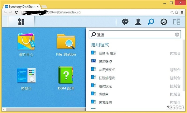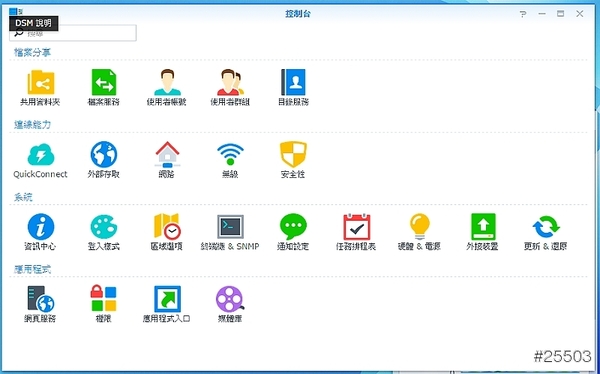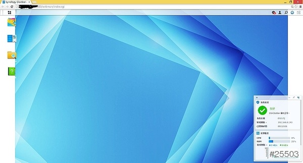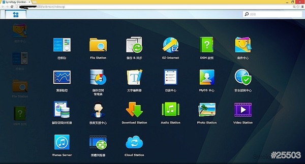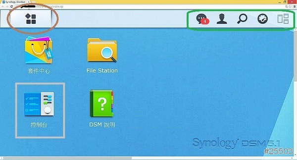 首先我們先來看看DSM5.1的功能介面一覽,可以看到採圖形化介面,感覺跟使用WINDOWS系統沒有太大差別,依樣有個桌面,程式也是點兩下就能夠開啟。另外右上有各種小圖示等下會依序介紹,當然也可以開啟類似WINDOWS的小工具那樣,可以即時顯示系統資訊或各種你所需要的資訊。