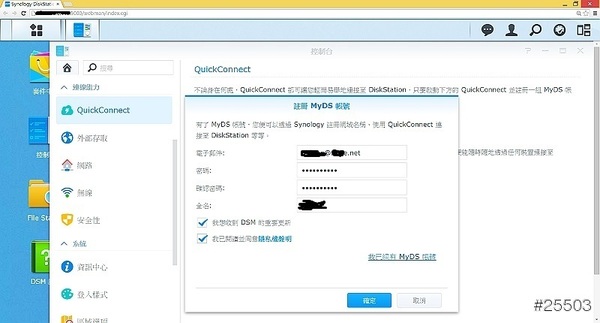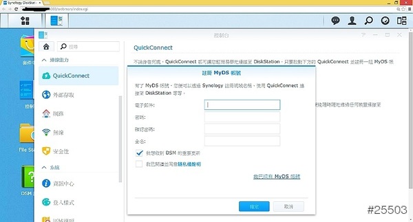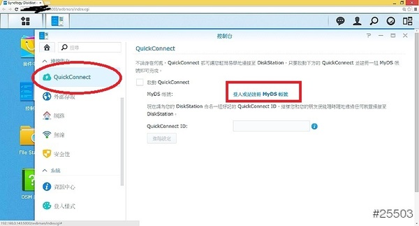 首先先進入控制台裡的連線能力,再點選QuickConnect ,就可以進入到設定頁面,然後再點選右邊長方形紅色框框裡點選註冊。