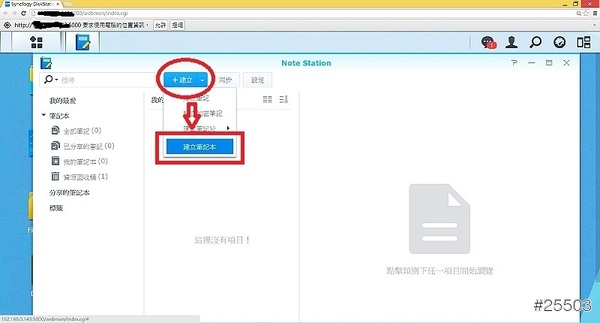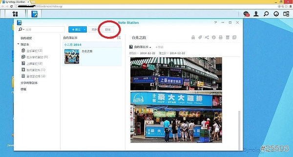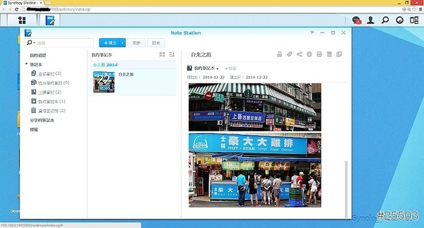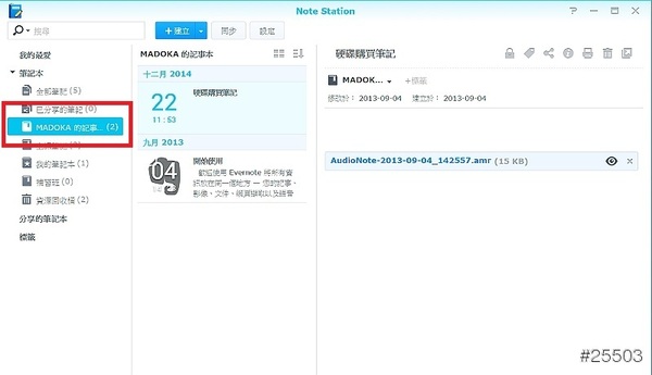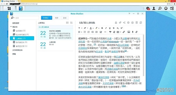 想要使用Note Station的功能,只要到套件中心點選Note Station這個套件即可使用。左側是筆記本的分類,中間則是該筆記本的分類的所屬筆記本,而最右邊則是點選筆記本的內容。