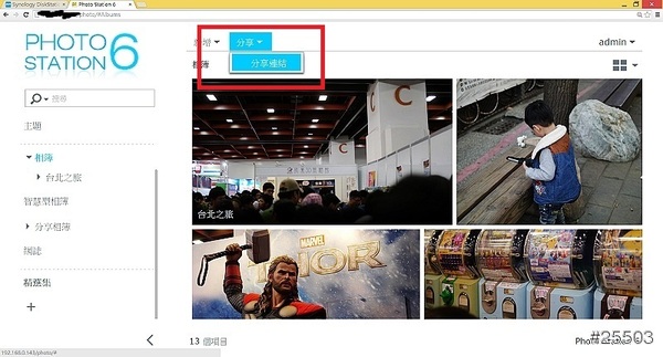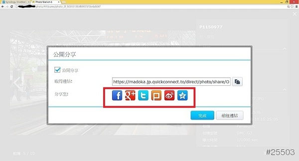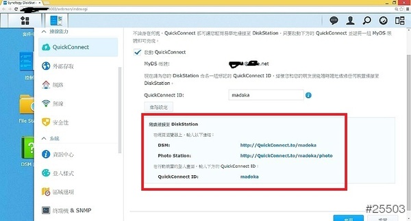 就會跑出下面網址連結紅色框框處,之後再可以在手機、平板、筆電等外部場所,連回家裡來使用NAS並且讀取資料。