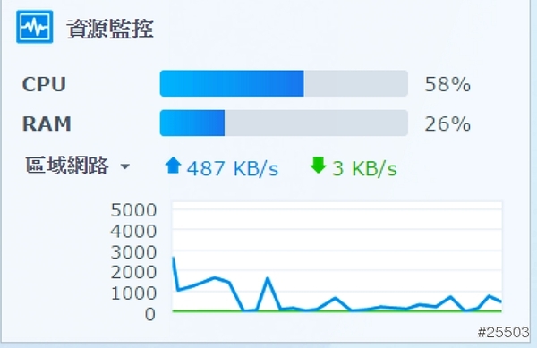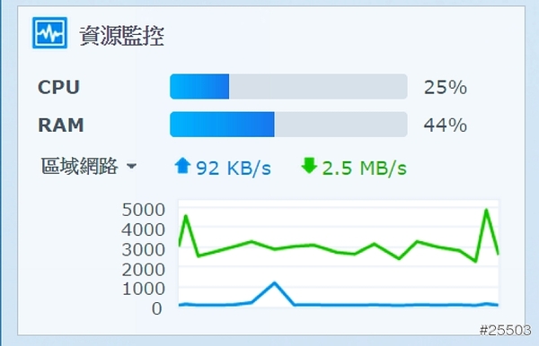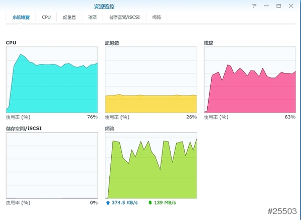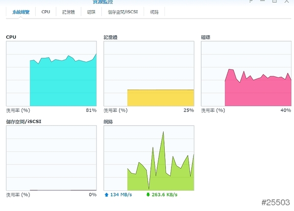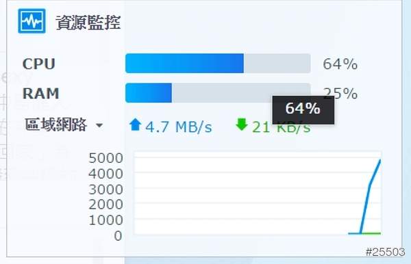 另外可以看一下傳輸時的系統負載度,可以看的出來都差不多,不管是從NAS到電腦硬碟或相反。