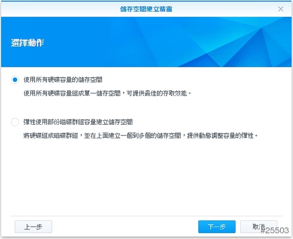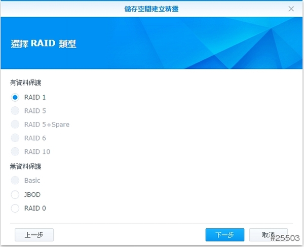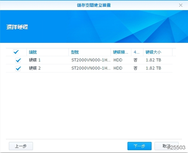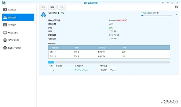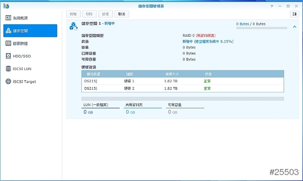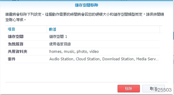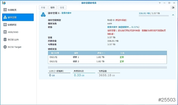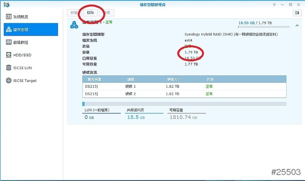 官方預設都是SHR,像我這次塞兩顆2TB硬碟進去,容量只有1.79TB,那是因為另外一顆用來當容錯硬碟,另外要更改RAID類型,請先按移除後再新增即可。