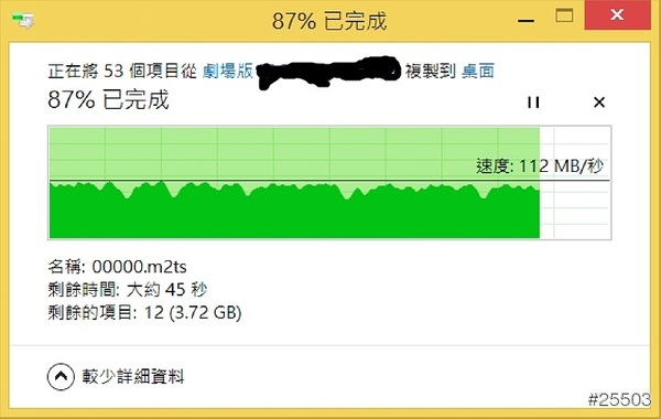 NAS到SSD(ocz vector 150),可以看一下RAID 0的效能,大概都維持在100-110MB/每秒左右。