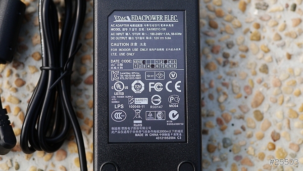 可以看到變壓器有通過安規及標示生產日期,另外型號為EDAC EA10521C-120 輸入為100-240V輸出為12V 5A。
