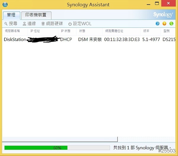 之後開啟Synology Assistant就會搜尋到DS215j,這時直接按右鍵安裝DSM5.1即可(下載中心有DSM5.1的安裝檔),如果還是搜尋不到請打+886 2 2552 5900 (技術支援專線),相信工程師會很熱心的服務。