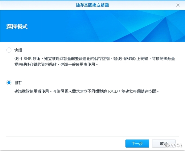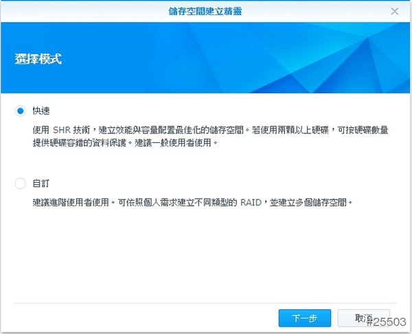 可以選擇快速,由系統幫你搞定,也可以自己自訂RAID類型。