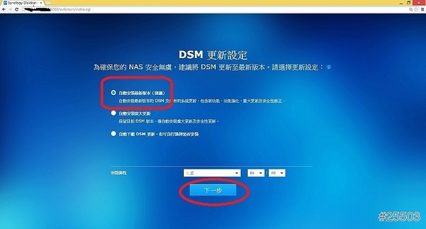 DSM更新設定,原則上建議使用自動安裝最新版本,之後按下一步。