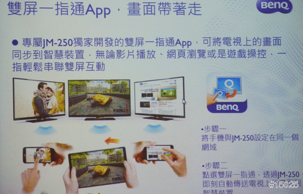 Benq獨家開發的"雙屏一指通APP",是專門開發給JM-250電視上網精靈用的軟體,能將JM-250 的影像即時傳送到手機,直接遙控電視上網精靈,還有可以立體遊戲操控。另外,自動偵測並傳送陀螺儀資料到電視上網精靈。
