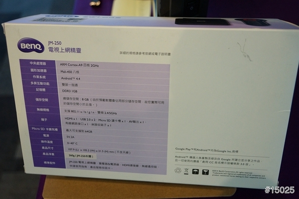 ▼BenQ電視上網精靈JM-250,主要強悍的硬體特色,不但採用了2GHz ARM Cortex-A9 四核心處理器,與Mali-450八核心圖形加速器,內建DDR3 1GB記憶體與8GB的儲存空間,更具備4K2K的播放能力,效能規格可說是十分強悍。