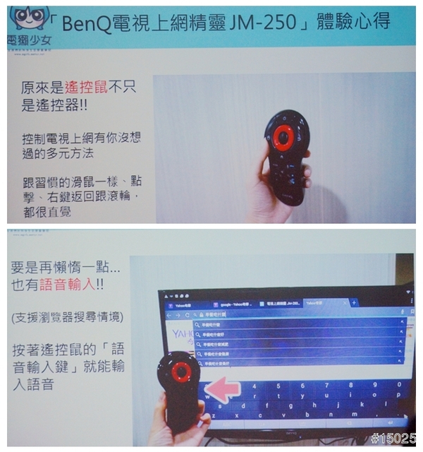 ▼另外,BenQ 智慧遙控器,還具有文字與聲音輸入等功能,讓使用者用手機就可以輕鬆遙控JM-250電視上網精靈。