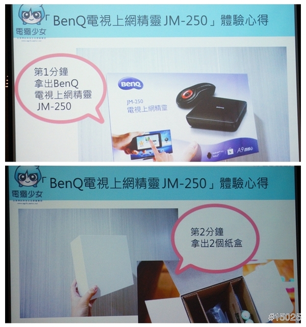 ▼蜜柑一開始介紹的切入點,跟其他達人分享的完全不一樣,沒有冷冰冰的硬體數字,也沒有艱深的專有名詞,而是"7分鐘就能安裝搞定",這完全跟男性的思考角度不同,女孩子最怕的就是如何安裝3C產品,蜜柑就是告訴你BENQ 電視上網精靈JM-250有多麼簡單安裝。