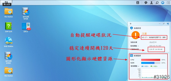 後記1/10:感謝網友的許多回應,重新修正補充一些資料,synology NAS 不只是網路硬碟, 本身就是 Linux-based 作業系統 , 包含了完整電腦的處理器 記憶體(遠遜於電腦) 超大硬碟空間 ,超高速網路介面 ,但是軟體功能的增加與變換的可能性 , 幾乎沒有盡頭,讓它近似一台迷你型伺服器,說它是網管老師的瑞士刀也不過份,但若要將上述功能全部使用、或使用人數多時,機器可能會無法負荷(可以觀看NAS內cpu 和ram的loading),可能就需要專門的伺服器,但是在家庭使用或一間辦公室使用倒是盡善盡美。