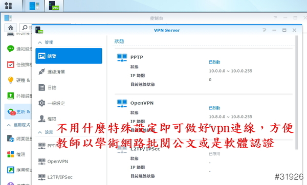 19vpn伺服器超簡單設定,讓學校行政人員可以從家中連線回學校,使用學術網路簽核公文,尤其學校內部使用虛擬IP,更可以透過synology nas與校內網路連接,取用校內資源。