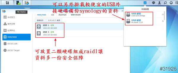 17可另外接USB外接硬碟備份synology(較為省錢做法),或者本身接二顆硬碟組成raid1讓資料多一分保障,教師校外研習回來可以直接把隨身碟接在synology馬上備份非常方便。