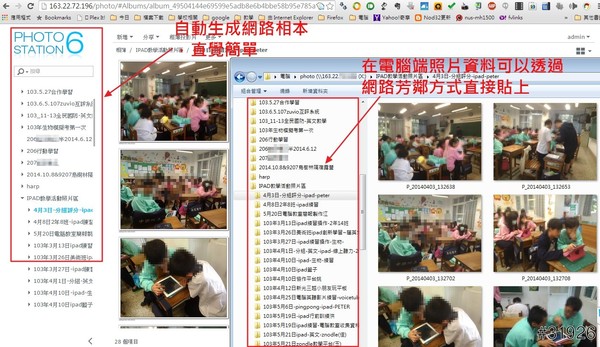 1photo存放師生學習歷程的照片、老師的教學影片,可讓學生做翻轉教室的學習,課前看預習的影片,課中教師的教學影片播放器,課後學生可以反覆複習,(照片影片轉檔建議用PC上傳,或者上傳至youtube再下載回來,讓youtube幫忙壓縮),一般學校大部份也都拿來做相片展示使用,只要把相片資料夾丟到photo中就可放後不理,它有多種展示方式,也可以設分享的權限或者分享到臉書等等非常實用