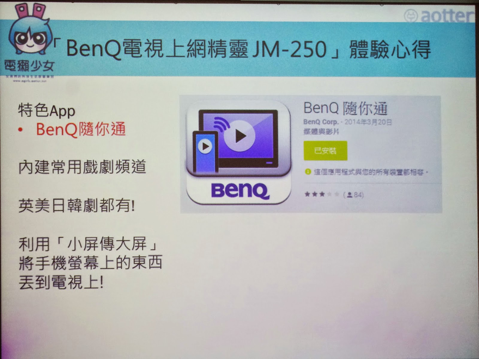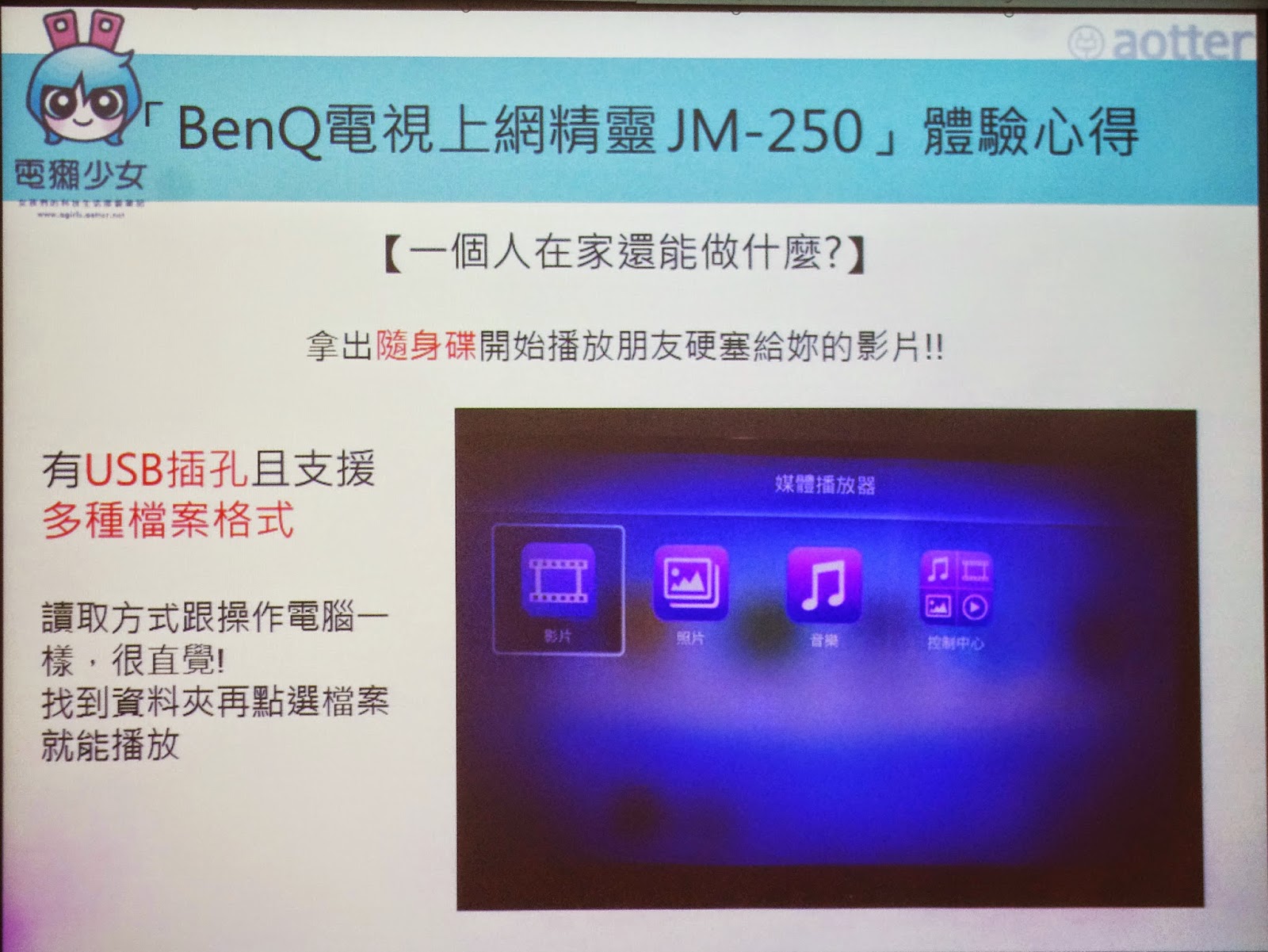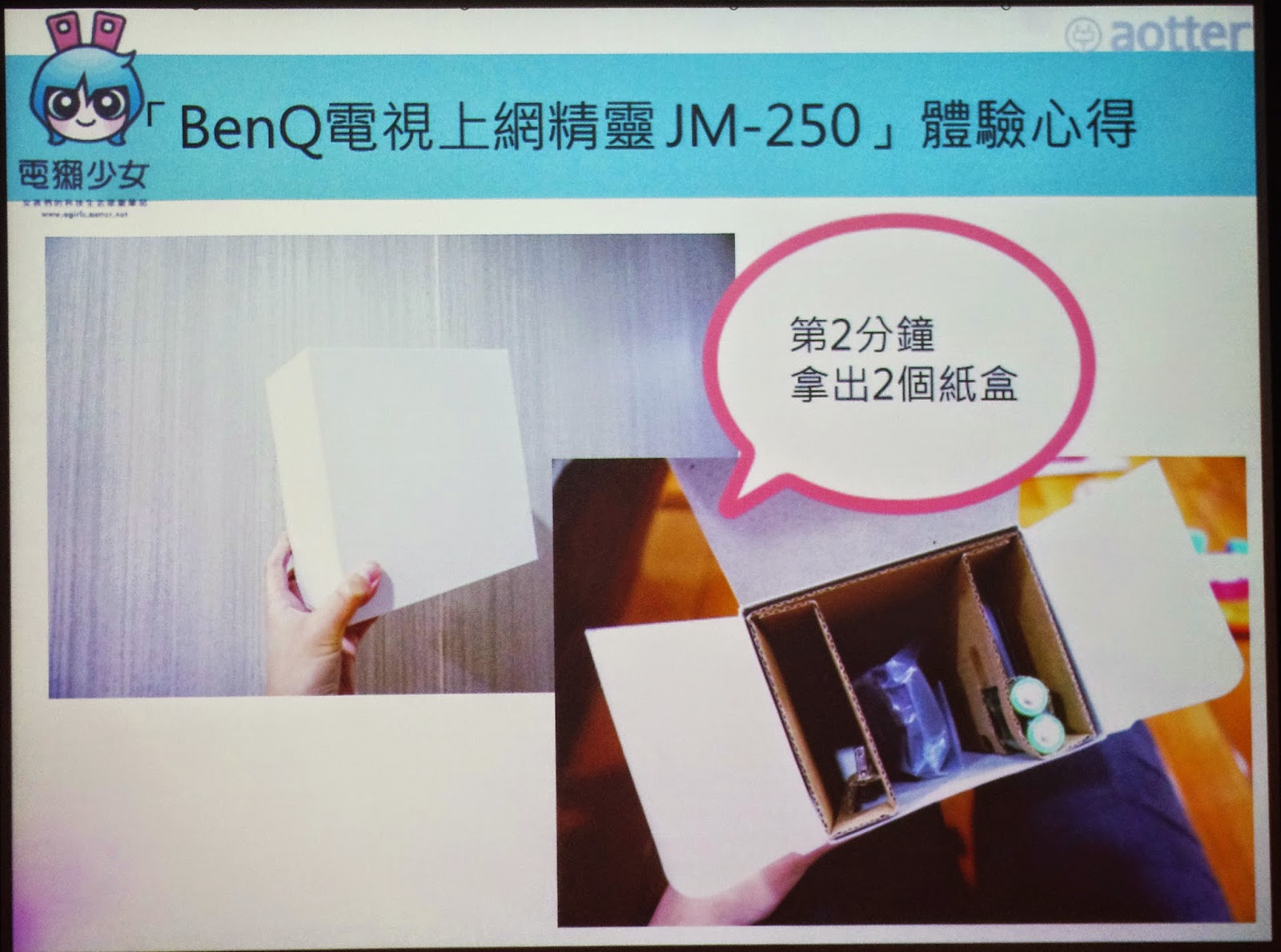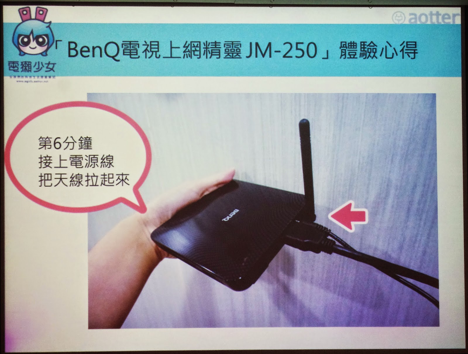這一次 BenQ JM-250 電視上網精靈的體驗會,除了有產品經理對產品的解說外,還請來了電腦王阿達和電獺少女的蜜柑來為大家分享心得,可以看的出來 Benq 對這產品的重視 ! 我將完整影片和重點節錄在下面,大家可以依照自己的方式來瞭解 BenQ JM-250 電視上網精靈的功能。