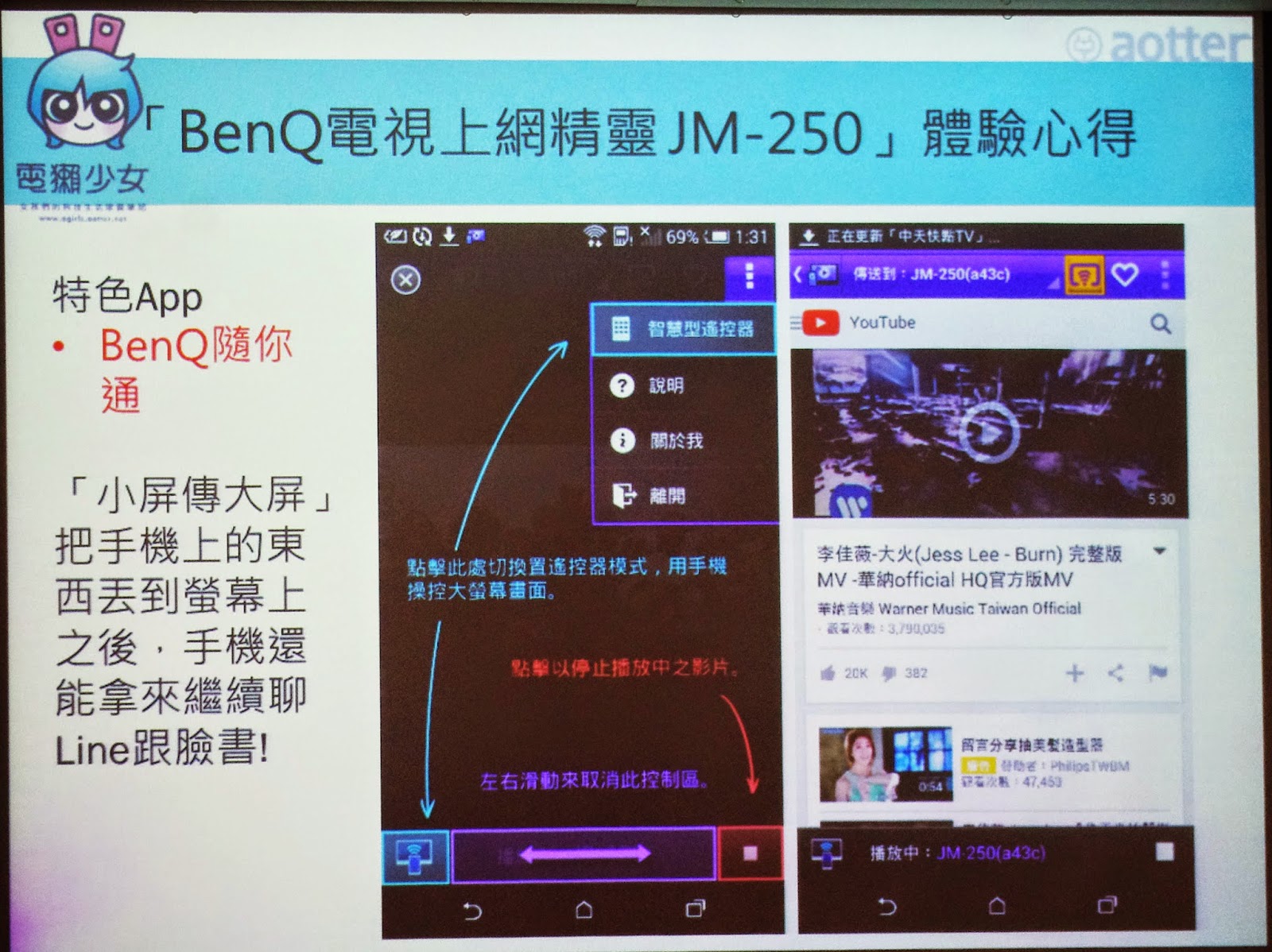 ▼ BenQ JM-250 可以利用 "隨你通App"可以將手機上的影音軟體影片( 如 youtube )上的影片傳到大螢幕電視上觀賞。