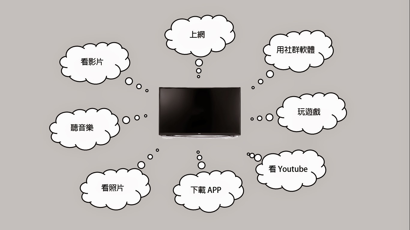 自從電視誕生在這世界上,電視最主要的功能就是播放節目給人觀賞,起初只能播放無線電視頻道節目,之後電視也可以看有線電視頻道節目了,隨著時代的進步,外接機器可以增加電視功能,像是外接播放機 (如 DVD 播放機、藍光播放機.. 等)可以播放影集和電影,外接遊戲機 (像是 PS4、Xbox360....等 ) 可以玩遊戲,這幾年電視也可以連接網路了,可以連接網路的電視就是現在正夯的智慧電視 ( Smart TV )。
