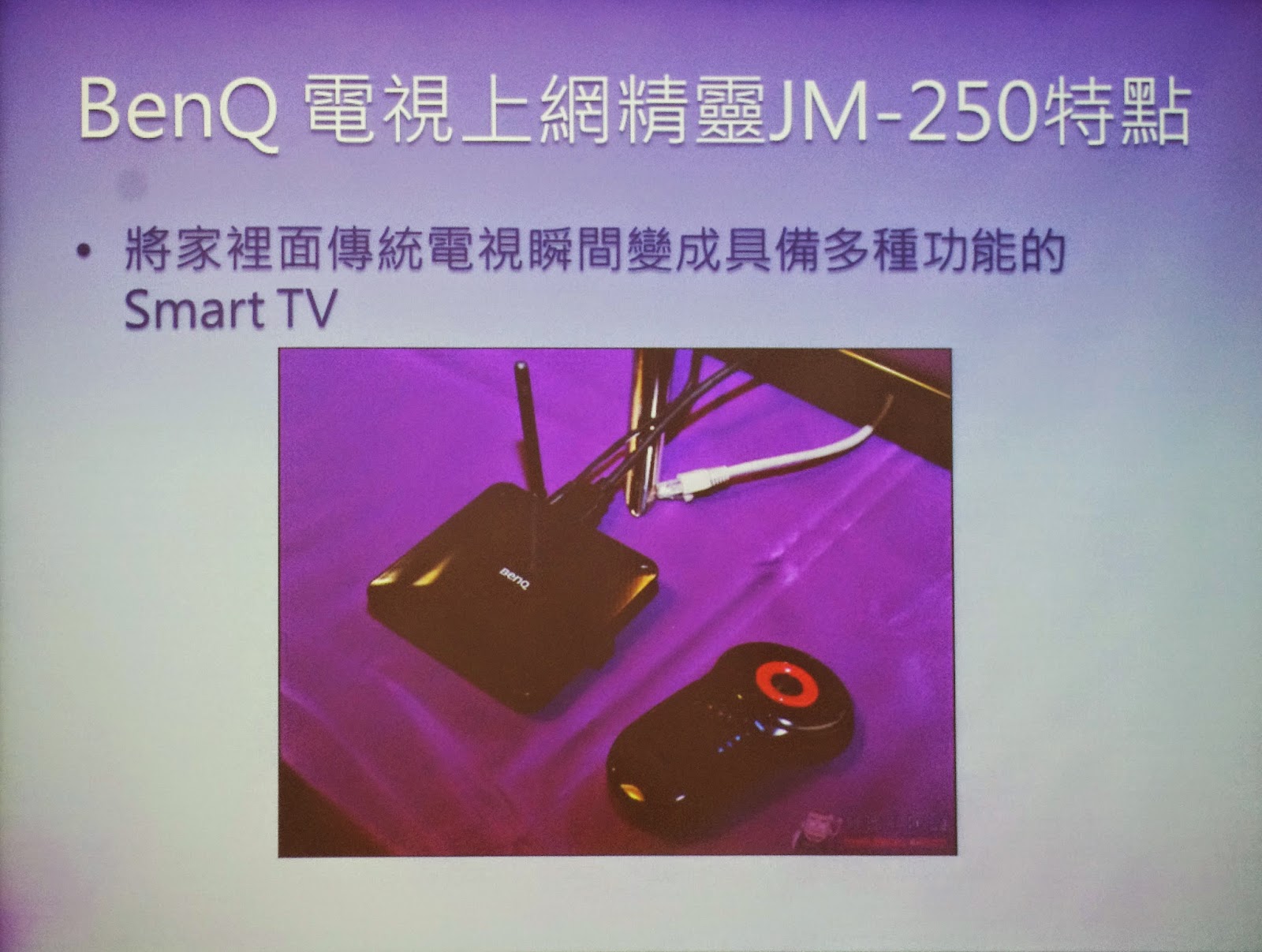 對於想要享受智慧電視( Smart TV )所帶來便利的人,就必須換掉原來電視再買台較昂貴的智慧電視才能擁有,而且能下載的 App 還是受廠商限制的,這會讓有意願想享受智慧電視的人卻步,有鑑於此,BenQ 出了電視上網精靈 JM-250,滿足想擁有智慧電視卻又捨不得換掉原來電視的人,只要你擁有 BenQ JM-250 電視上網精靈,不但可以立即將家中電視升級成智慧電視( Smart TV ),更可以透過唯一經過 Google 認證的 Goolge Play 來下載數以萬計的 App 來提升 BenQ JM-250 電視上網精靈的功能性。當我接觸到 BenQ JM-250 電視上網精靈時,真可以說是無比的興奮,很榮幸可以參加 BenQ JM-250 電視上網精靈體驗會,接下來就來一一解析 BenQ JM-250 電視上網精靈所擁有的魅力吧!