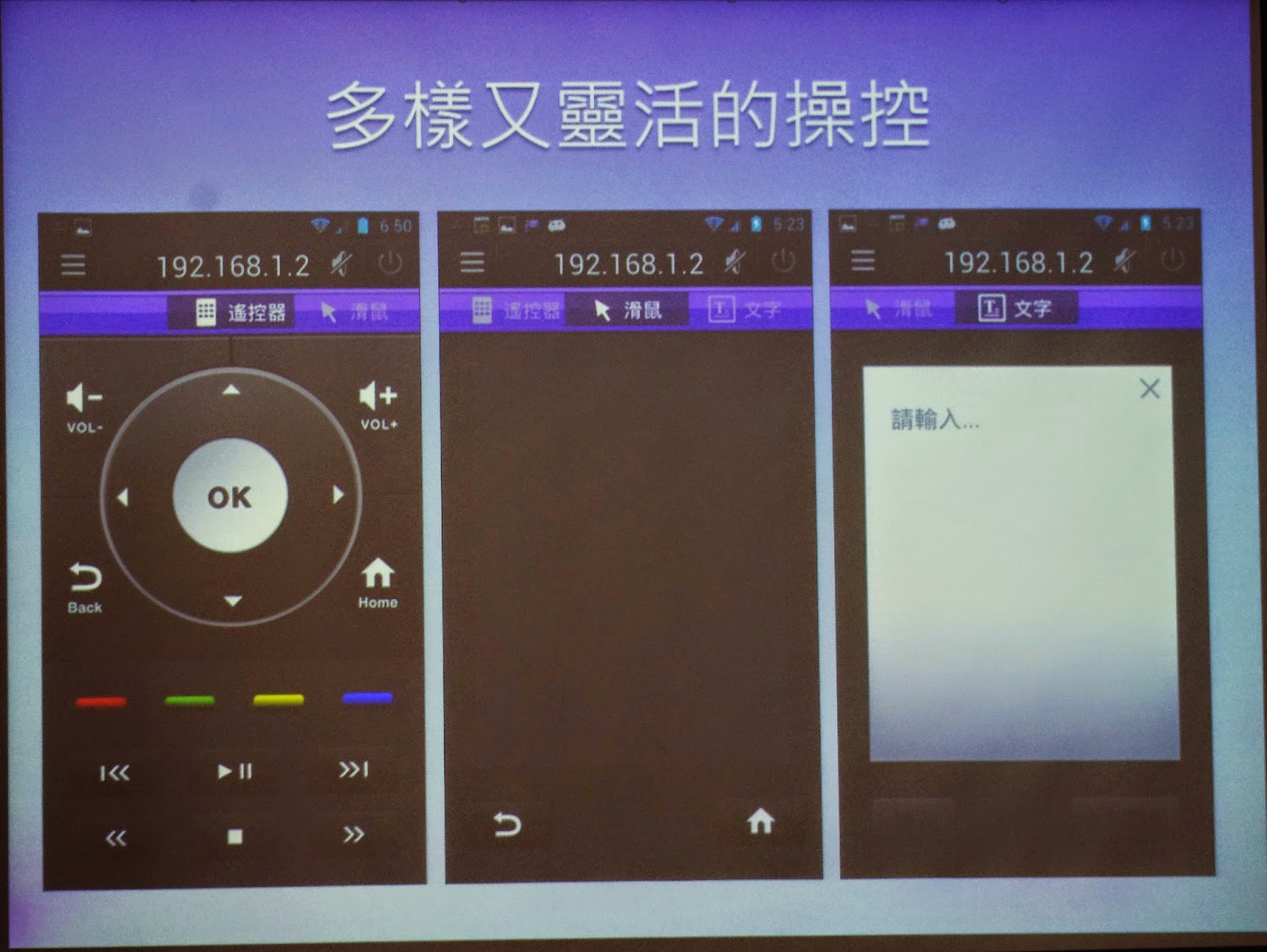 ▼ BenQ JM-250 用手機的操控方式很多元,,有傳統遙控器介面(左),也可以手寫(中間),更可以用文字輸入(右)可以用 Andriod 和 iOS 手機都可以操控。