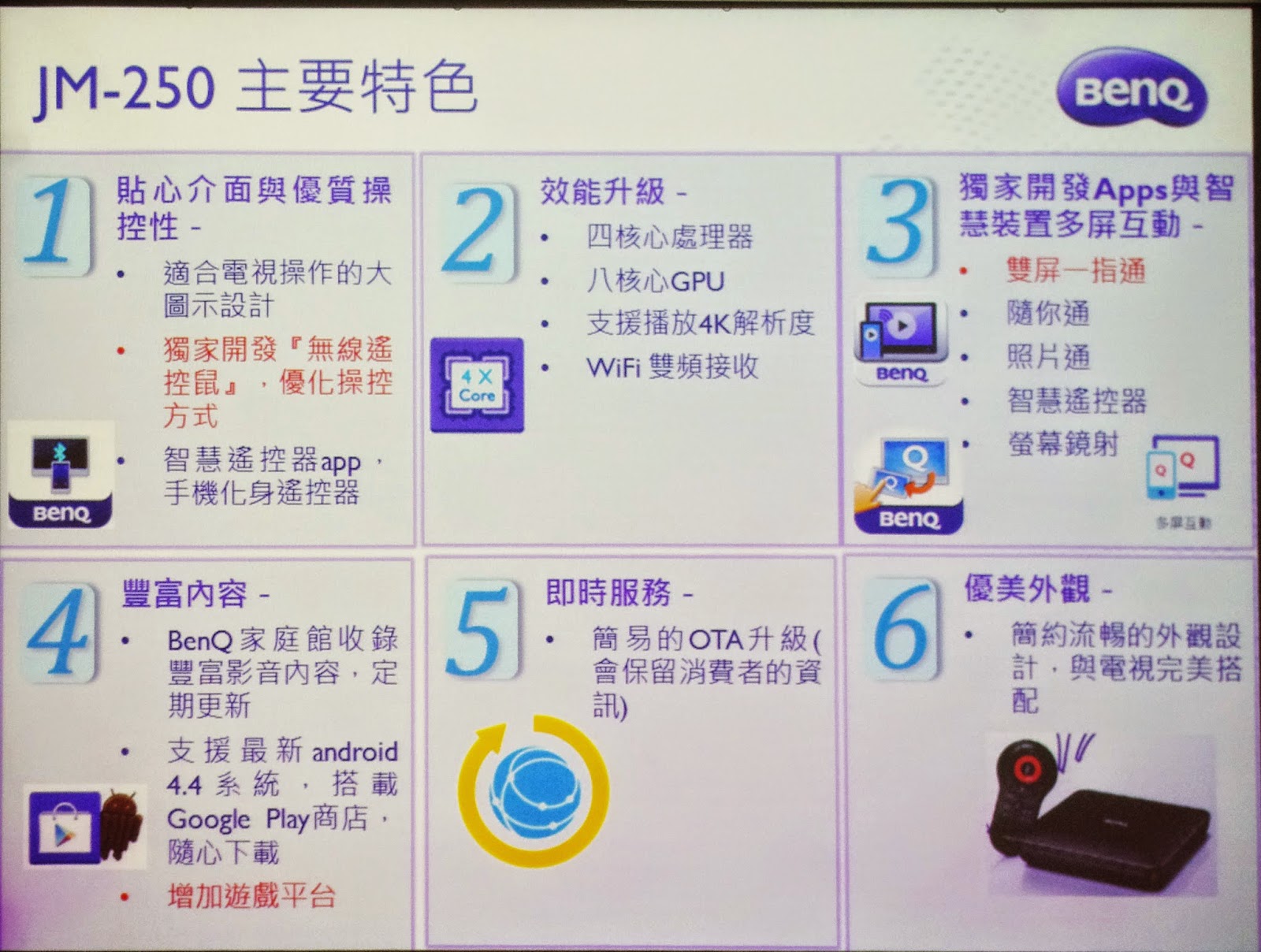 ▼ BenQ JM-250 具有 : 1. HDMI 連接。 2. 操作介面適合大螢幕。 3. 四核心處理器。 4.支援 4K2K 解析度。 5. 具有 Google Play