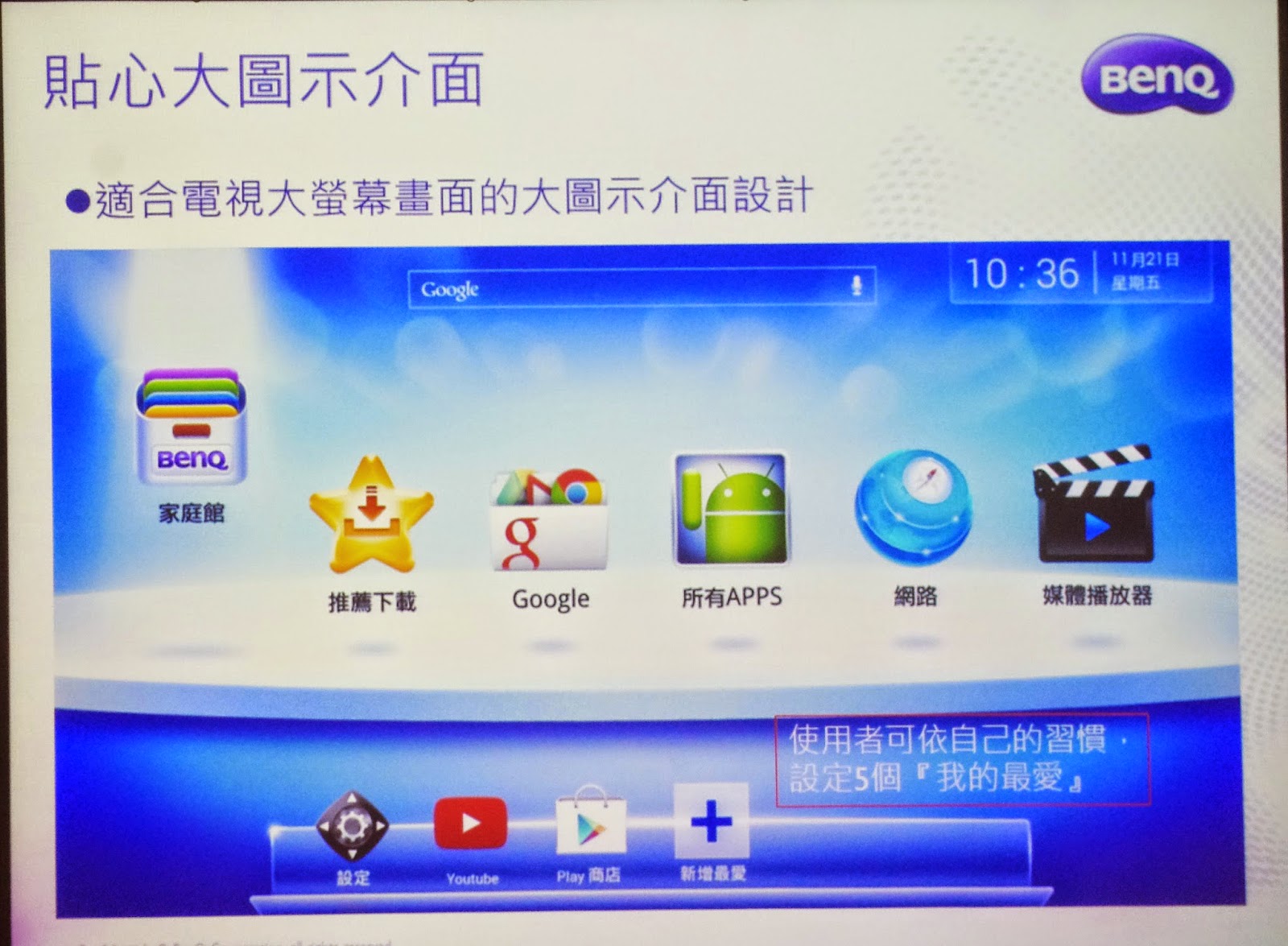 ▼ BenQ JM-250 的介面是完全為大螢幕電視設計的,不像以往很多電視盒子只是把 Andriod 平板介面做到電視上而已。