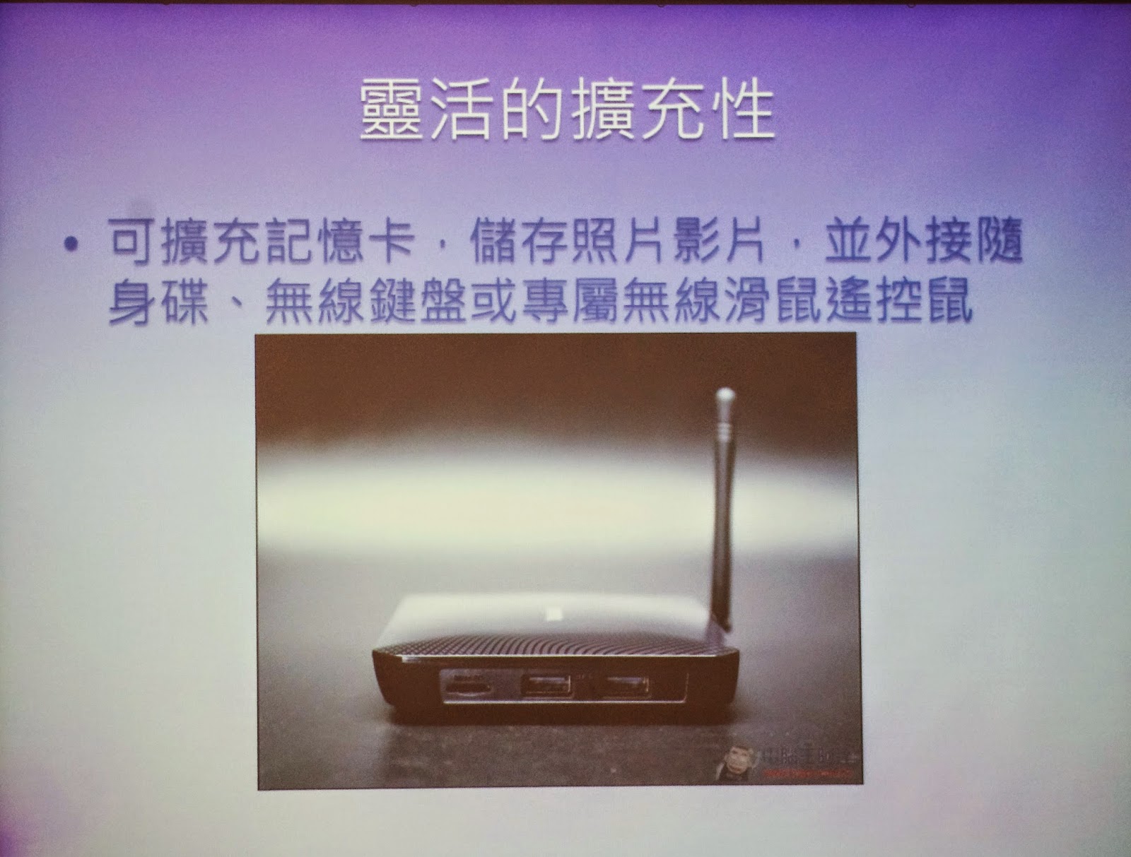 ▼ 機身右側配置了 Micro SD 擴充槽(最大支援到64GB),有兩組 USB 連接埠,可外接一般的無線鍵盤、隨身碟、外接式硬碟,不過如果要用專用的無線遙控鼠的話,其中一個 USB 會被佔用,這一點是買的人要多注意的。至於主機左側面,看起來就是一般的散熱孔。