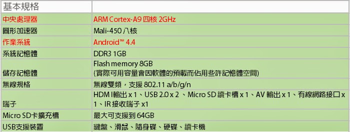 ▼ BenQ JM-250 有非常強大的硬體規格(如下圖規格表),BenQ JM-250 是 2 GHz 的 A9 四核心處理器、Mali-450 八核心處理器、搭載 Andriod 4.4 規格,系統記憶體為 1 GB、具有2.4G 和 5GHz 雙頻段 WiFi ,並且可以播放 4K2K 影片,真可以說是功能及支援性強大的電視盒子。