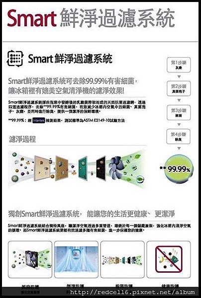 【▼】LG Smart 鮮淨過濾系統採天然抗菌過濾網,透過四道過濾程序,去除99.99%有害細菌,有效減少冰箱內空氣中的細菌、真菌孢子、灰塵,並同時進行除臭,有別於競爭廠牌會一併改變食物原味的情況LG Smart 鮮淨過濾系統能在保持食物原味的情況下提供一個潔淨的保鮮環境。