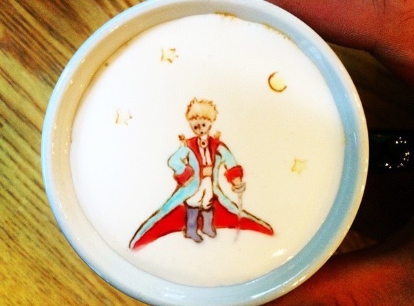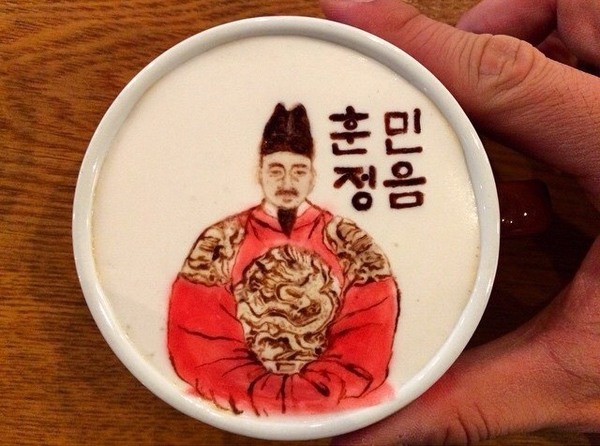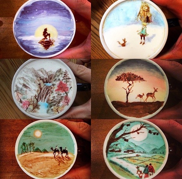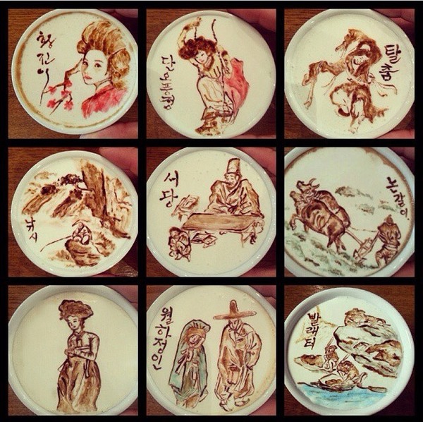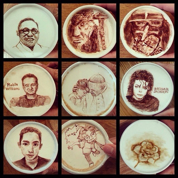 有別於其他的拉花作品,Kangbin Lee 的作品大多是走像這樣的素描風,利用巧克力一筆一畫的勾勒出人物的外觀,連小細節都不放過,細膩而寫實,陰影的部分也處理的相當好,讓人不禁以為這其實是一幅畫作,我想這就是他的拉花總是會深得人心的地方吧!