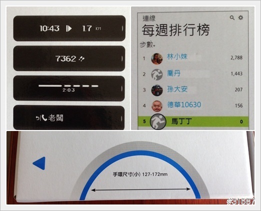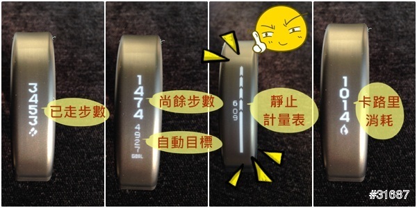 這款手環最特別的地方就在第三個圖”靜止計量表”,當你坐太久沒有活動的時候,手環會”震動”,並在螢幕上顯示該起來動一動了~