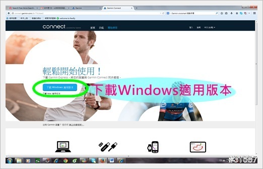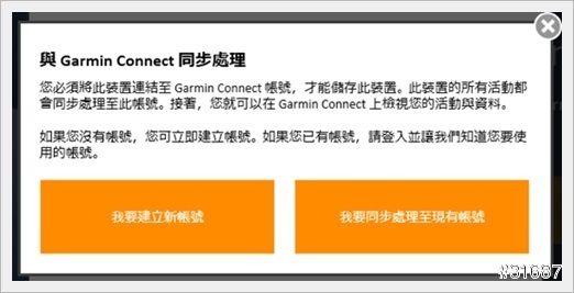 接下來,開啟Garmin Express小地球圖示,點選開始使用→新增裝置→與Garmin Connect同步處理(沒有帳號的人請點選我要建立新帳號,已有帳號的人請點選右邊)。