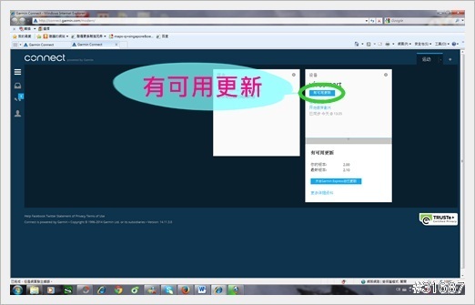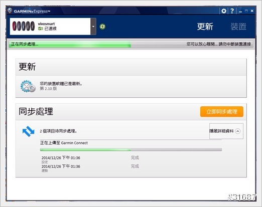 開啟Garmin Connect的同時,他會提醒使用者是否有vivosmart的版本更新,只要點選”有可用更新”,開啟Garmin Express小地球圖示即可更新軟體(同步進行時請勿中斷裝置唷!!)。